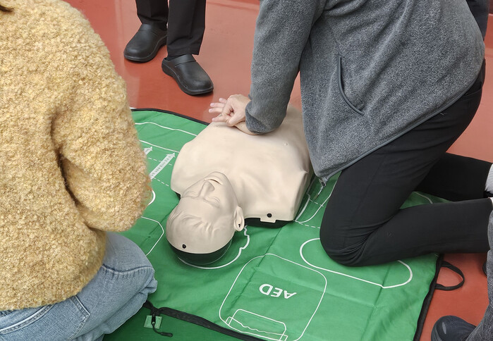 교육은 이론 강의와 함께 심폐소생술(CPR) ‧ 자동심장충격기(AED) 실습으로 구성된다.