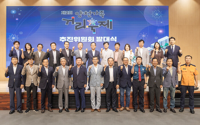 서울 양천구가 9일 오후 구청 3층 양천디지털미디어센터에서 ‘제2회 양천가족 거리축제’ 추진위원회 발대식을 개최했다. 사진은 이기재 구청장(앞줄 가운데)이 발대식에서 기념 촬영을 하는 모습. (사진=양천구청 제공)