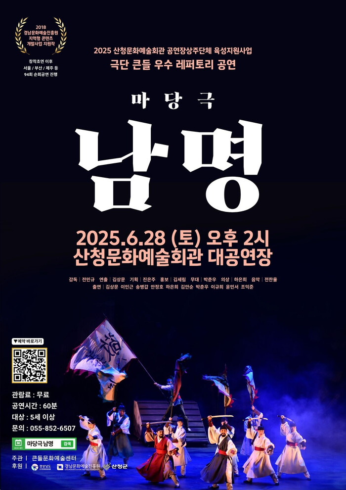 오는 28일 오후 2시 산청군문화예술회관 대공연장에서 열리는 이번 공연에서는 극단 큰들의 마당극 ‘남명’이 열린다.