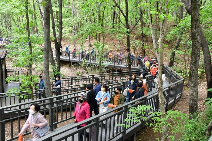 | ▲ 지난 4일 정식 개통한 수락산 순환산책로를 걷고 있는 주민들의 모습. (사진제공=노원구청) |
