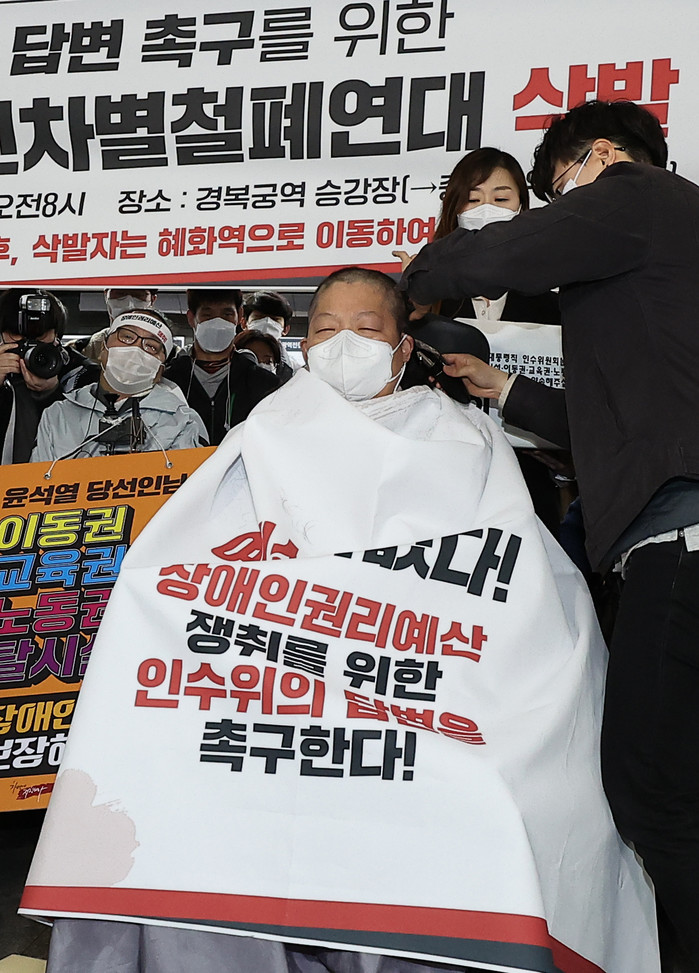 30일 오전 서울 종로구 지하철 3호선 경복궁역 탑승장에서 전국장애인차별철폐연대가 진행한 장애인권리예산 및 관련법 개정 요구에 대한 인수위 답변 촉구 삭발 투쟁 결의식에서 이형숙 서울시장애인자립생활센터협의회장이 삭발하고 있다.