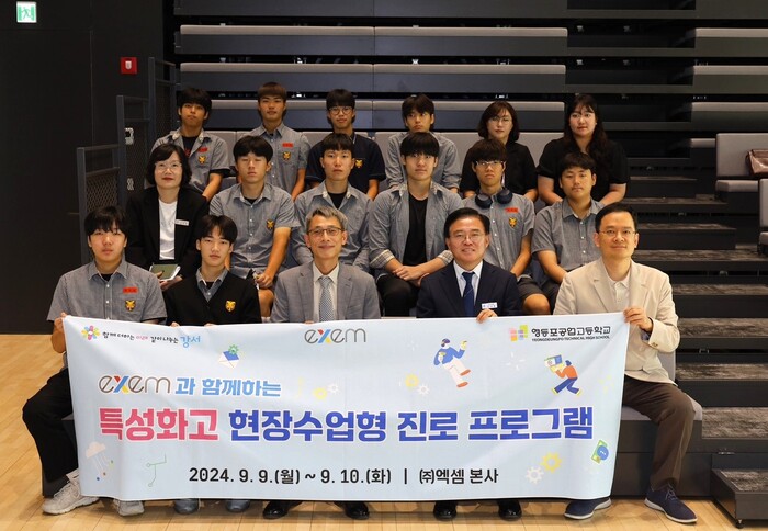 진교훈 서울 강서구청장이 지난 9일 IT기업 엑셈에서 열린 ‘특성화고 현장수업형 진로 프로그램’에 참석해 학생들을 격려하고 프로그램 운영 현황을 살폈다. 사진은 진교훈 구청장(앞줄 오른쪽 두 번째)이 학생들과 기념촬영을 하고 있는 모습. (사진=강서구청 제공)