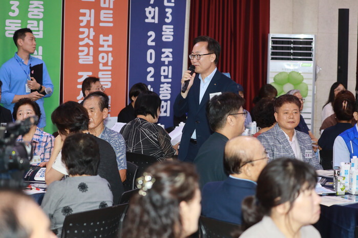 | ▲ 유성훈 금천구청장이 지난해 진행한 독산3동 주민총회에서 주민자치회 운영 방향에 대해 설명하고 있다. (사진=금천구청 제공) |