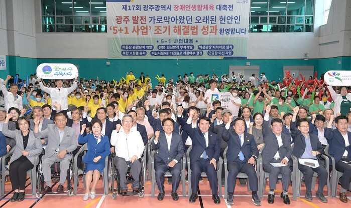 [광주=정찬남 기자] 광주광역시장애인체육회장인 강기정 광주광역시장은 25일 광주장애인국민체육센터에서 열린 제17회 광주광역시 장애인생활체육대축전 개회식에 참석, 선수단을 격려했다.