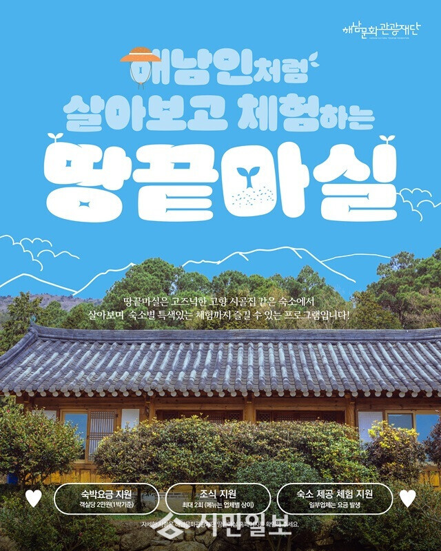 오는 12월 15일까지 운영되는 땅끝마실은 해남을 상징하는 ‘땅끝’과 이웃에 놀러 다니는 일을 뜻하는 ‘마실’을 합한 의미로 해남에서 지역민처럼 살아보고 체험하는 프로그램이다.