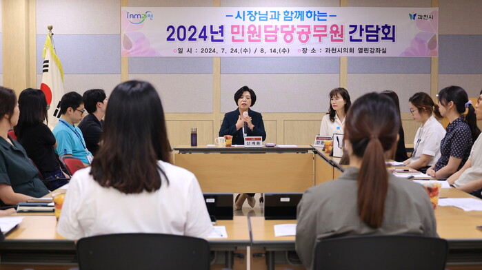 신계용 경기 과천시장은 최근 민원 담당 공무원과 간담회를 열어 직원들의 업무상 애로사항을 듣고 민원 현안을 논의했다. 사진은 신 시장(가운데)이 인허가 업무 담당자, 고충 민원 담당 공무원들과 간담회를 하고 있는 모습. (사진=과천시청 제공)