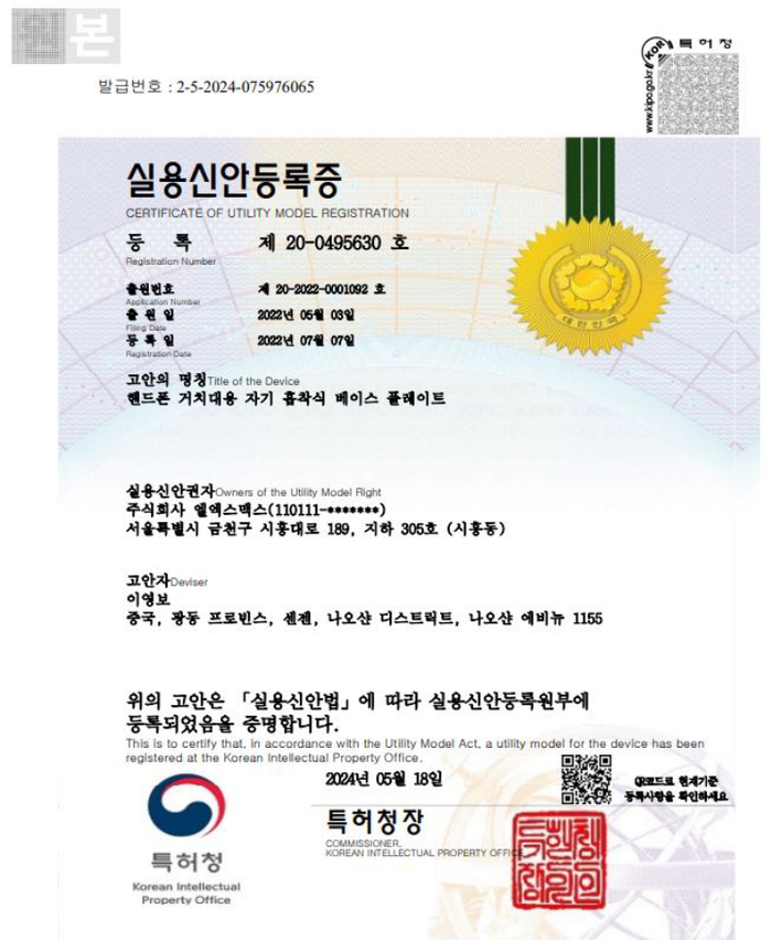 해당 특허는 사용자의 편의성을 증대시키는 ‘자기 흡착식 베이스 플레이트’를 포함하고 있으며, 최신 기술인 핸드폰 뒷면 마그네틱 맥세이프 기능이 활용됐다.