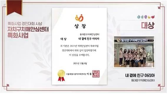 [시민일보 = 이대우 기자] 동대문구(구청장 유덕열)는 치매안심센터가 서울시 주관 2021년 치매관리 사업성과 평가 대회 특화사업 경진대회 부문에서 특화사업인 ‘내 곁에 친구 아리아 돌봄 스마트홈 실현’으로 대상을 수상했다고 21일 밝혔다.