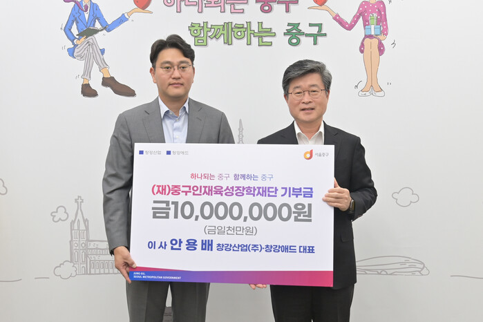 [시민일보 = 여영준 기자] 서울 중구(구청장 김길성)는 (주)창강산업·창강애드로부터 장학금 1000만원을 기탁받았다고 22일 밝혔다.