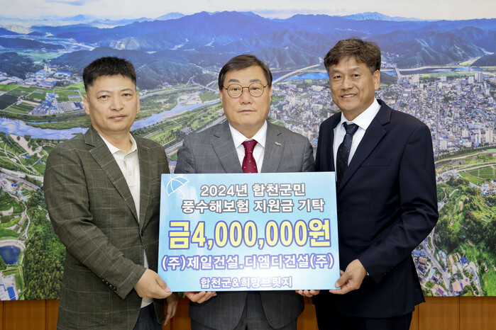 ㈜제일건설, 디엠디건설(주)은 “풍수해보험 지원금 기탁을 통해, 풍수해로 인한 주택피해 시 합천군민에 큰 도움이 되길 바란다”고 말했다.
