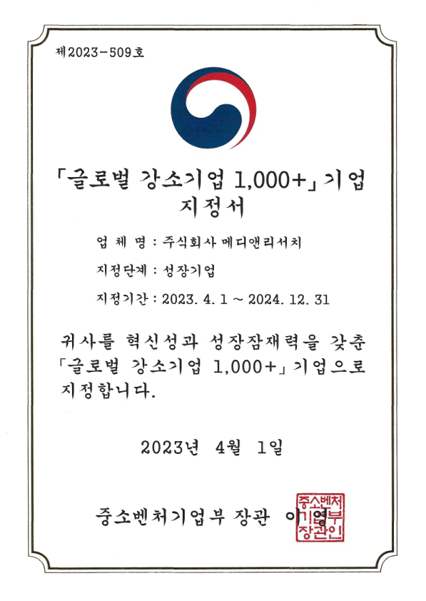 | ▲ 주식회사 메디앤리서치 ‘2023년 글로벌 강소기업 1000+ 프로젝트’ 지정서 |