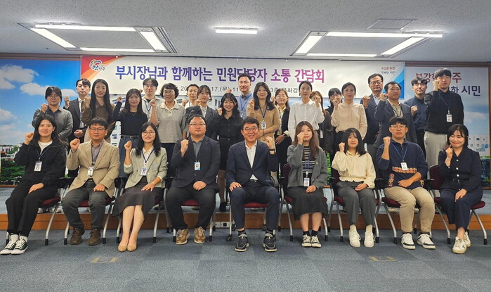 진주시는 17일 3분기 민원처리 우수 공무원 및 친절 공무원 30여 명이 참석한 가운데 시청 3층 문화강좌실에서 차석호 진주시 부시장 주재로 소통 간담회를 열었다.
