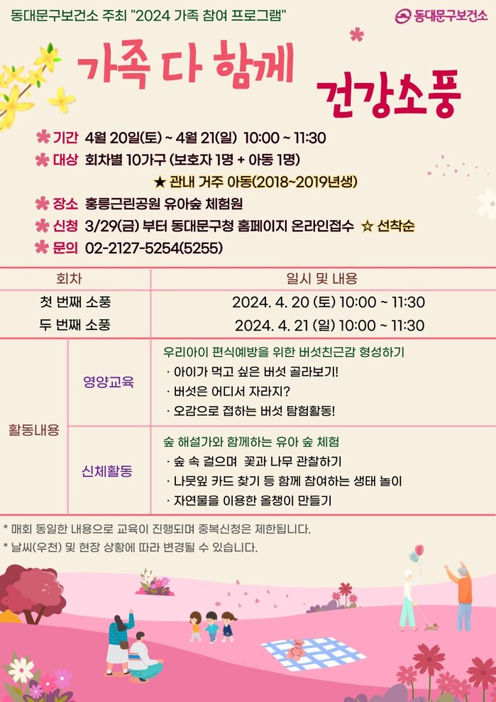 [시민일보 = 이대우 기자] 서울 동대문구(구청장 이필형)에서 오는 20, 21일 양일간 홍릉근린공원 유아숲체험장에서 가족 참여 프로그램 ‘가족 다함께, 건강소풍’이 진행된다.