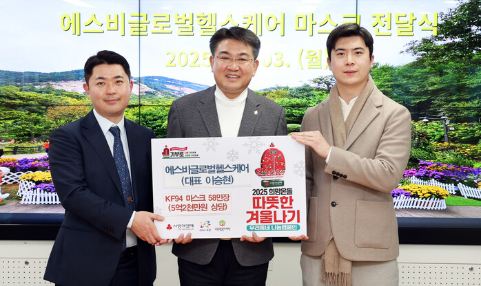 이번 기부에는 에스비글로벌헬스케어와 아이바나리가 참여해 총 5억4400만원 상당의 성품을 전달했다. 에스비글로벌헬스케어는 KF94 마스크 58만장(5억2000만원 상당)을, 아이바나리는 비건 인증 마스크팩 8000장(2400만원 상당)을 기부하며 지역사회 나눔에 동참했다.