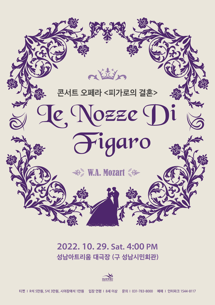 [성남=오왕석 기자] 성남문화재단이 콘서트 오페라 <피가로의 결혼>을 오는 10월 29일(토) 오후 4시 성남아트리움(구 성남시민회관) 대극장에서 진행한다.