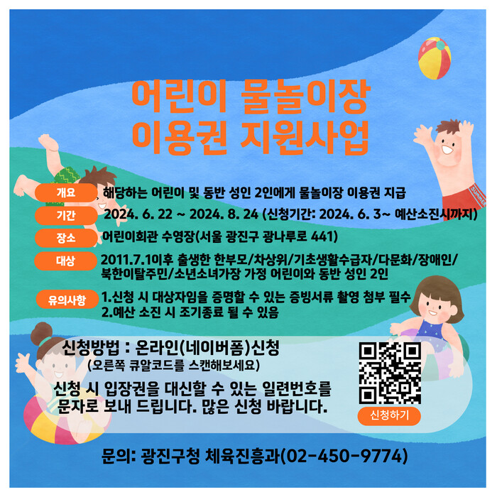 [시민일보 = 여영준 기자] 서울 광진구(구청장 김경호)가 취약계층 어린이의 여름철 여가 생활 지원을 위해, 물놀이장 이용권을 무료로 지원한다.