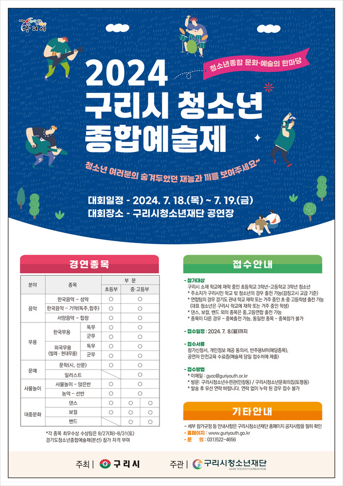 [시민일보 = 민장홍 기자] 경기 구리시청소년재단은 문화·예술 분야에서 재능을 펼칠 수 있는 ‘2024년 구리시 청소년 종합예술제’ 참가자를 오는 7월8일까지 모집한다.