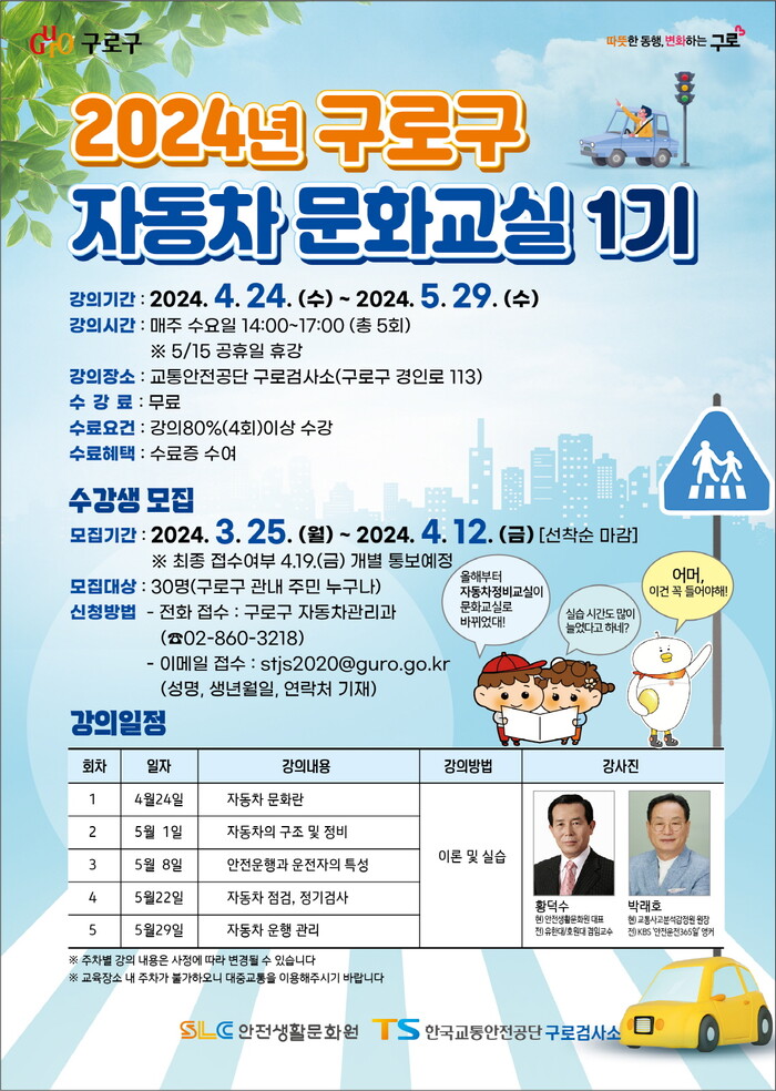 [시민일보 = 이대우 기자] 서울 구로구(구청장 문헌일)가 ‘2024년 자동차 문화교실 1기’ 수강생 30명을 선착순 모집한다.