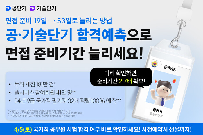 [시민일보 = 여영준 기자] 에스티유니타스의 공무원 시험 전문 브랜드 ‘공단기·기술단기’가 2025년 국가직 9급 필기시험 응시자를 위한 ‘합격예측 풀서비스’운영과 사전예약 이벤트를 진행한다고 3일 밝혔다.