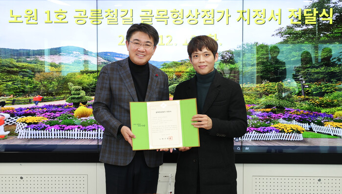 오승록 서울 노원구청장이 10일 ‘노원 제1호 골목형상점가’ 지정서를 전달했다. 제1호 골목형상점가로 지정된 ‘공릉철길 골목형상점가’는 경춘선 숲길과 인접했으며 음식점, 카페 등 다양한 업종이 밀집한 골목상권이다. 사진은 오 구청장(왼쪽)이 지정서를 최정민 상인회 회장에게 전달한 뒤 기념촬영을 하는 모습. (사진=노원구청 제공)