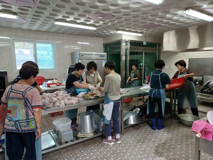 경기 이천시 창전동 부녀민원봉사대는 최근 지역내에 거주하는 50명의 저소득 노인들에게 ‘사랑의 삼계탕 나눔’ 활동을 펼쳤다. 사진은 이날 참여한 봉사자들이 삼계탕을 요리하고 있는 모습. (사진=이천시청 제공)