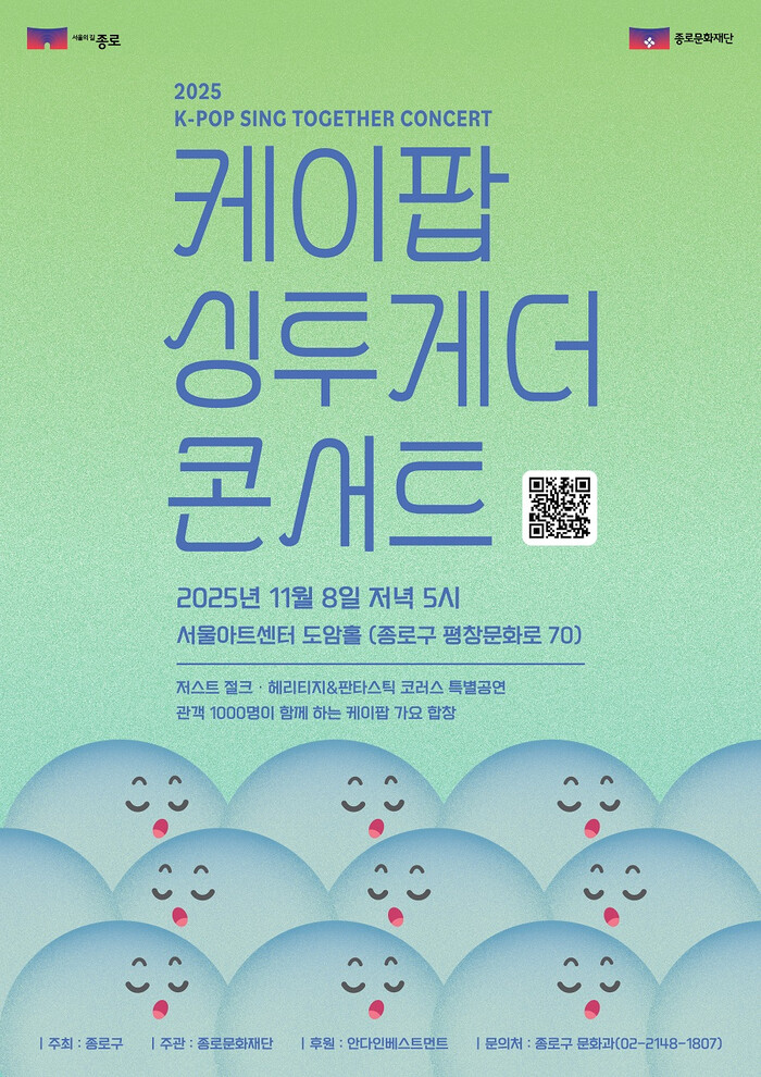 [시민일보 = 이대우 기자] 서울 종로구(구청장 정문헌)가 오는 8일 오후 5시 서울아트센터 도암홀(평창문화로 70)에서 ‘케이팝 싱투게더 콘서트’를 개최한다.