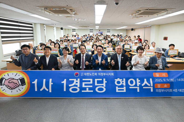 대한노인회 의정부시지회가 9일 ‘1사1경로당 협약식’을 열고, 39개 후원사와 39개 경로당 간 지원 협약을 체결했다. 사진은 협약식에서 김동근 경기 의정부시장(앞줄 오른쪽 네 번째)이 기념 촬영을 하는 모습. (사진=의정부시청 제공)
