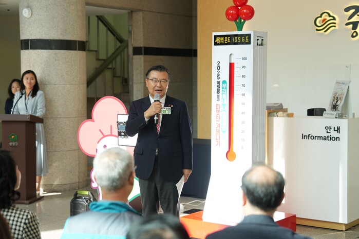 [시민일보 = 여영준 기자] 서울 중랑구(구청장 류경기)가 최근 구청 1층 로비에서 ‘2025 희망온돌 따뜻한 겨울나기’의 시작을 알리는 사랑의 열매 온도탑 제막식을 개최했다.