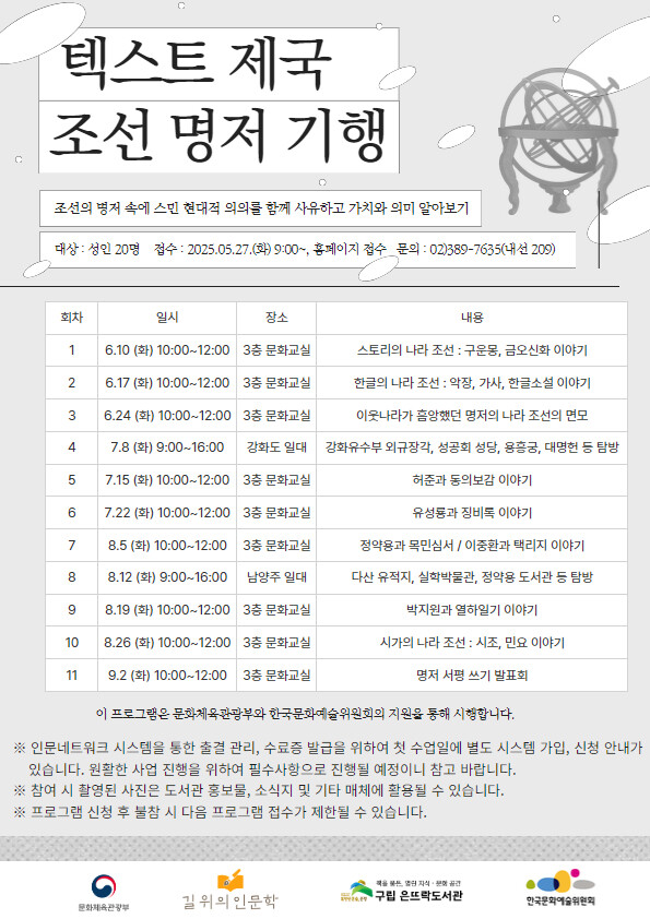 구립 은뜨락도서관 관계자는 “프로그램을 통해 조선의 명저를 탐색하고 현대 사회에서 그 안에 스민 가치와 의미를 되새겨보는 시간이 되길 바란다”고 말했다.