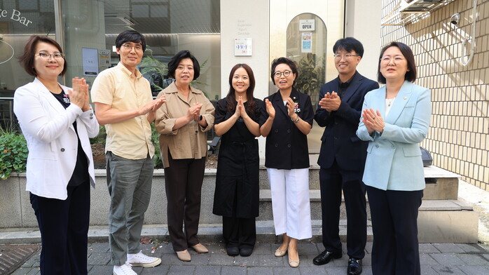 경기 과천시 원문권역 지역사회보장협의체는 최근 SLB샐러드 과천점에서 ‘나눔가게’ 34호점 기부 협약식과 현판식을 했다. 나눔가게 34호점이 된 SLB샐러드는 매월 샐러드, 샌드위치 등을 어려운 이웃에 지원할 계획이다. 사진은 신계용 시장(왼쪽 세 번째)과 관계자들이 현판식 후 기념촬영을 하고 있는 모습. (사진=과천시청 제공)