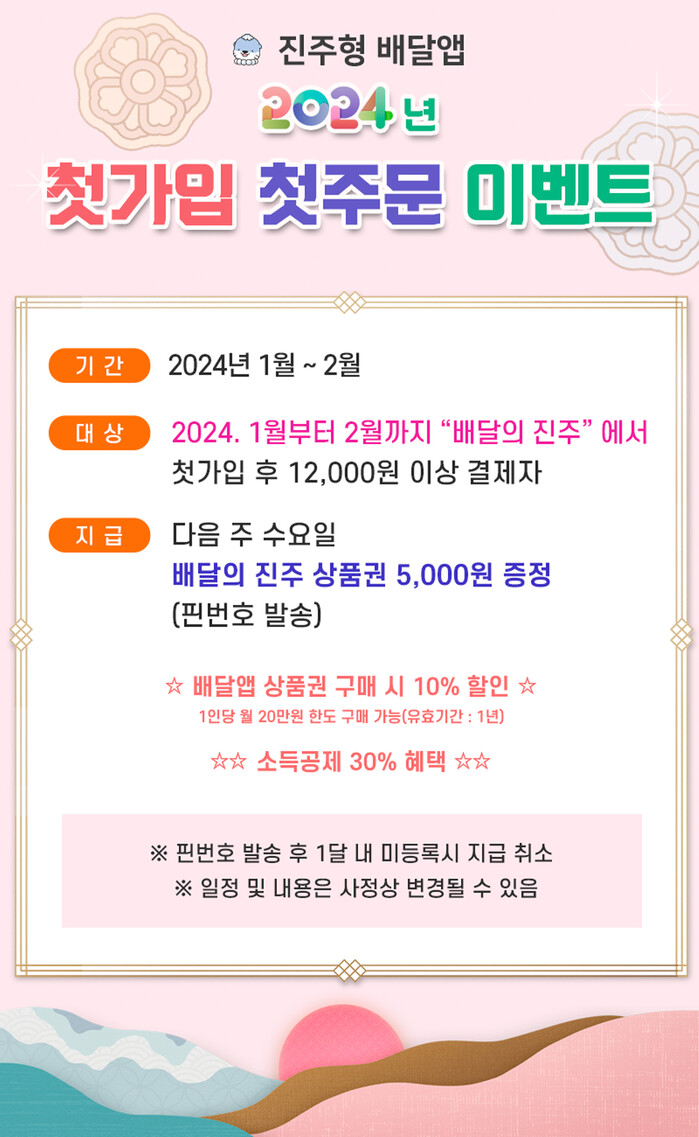 2024년 1월 1일부터 2월 29일까지 진주형 배달앱 ‘배달의 진주’에 첫 가입하고 1만 2000원 이상 첫 주문하면 다음주 수요일 진주형 배달앱 전용 상품권 5천 원을 받는 이벤트이다.