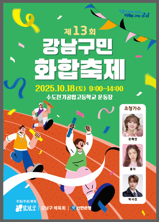 [시민일보 = 이대우 기자] 서울 강남구(구청장 조성명)가 오는 18일 오전 9시~오후 2시 수도전기공업고등학교 운동장에서 ‘제13회 강남구민화합축제’를 개최한다.