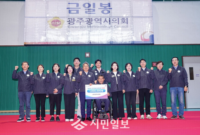 | ▲ 강기정 광주광역시장(왼 쪽부터 6번 째)이 17일 오전 서구 장애인국민체육센터에서 열린 '제45회 전국장애인체육대회 광주선수단 결단식'에 참석해 기관·기업체로부터 격려금을 전달 받은 뒤 기념촬영을 하고 있다./광주광역시 제공 |