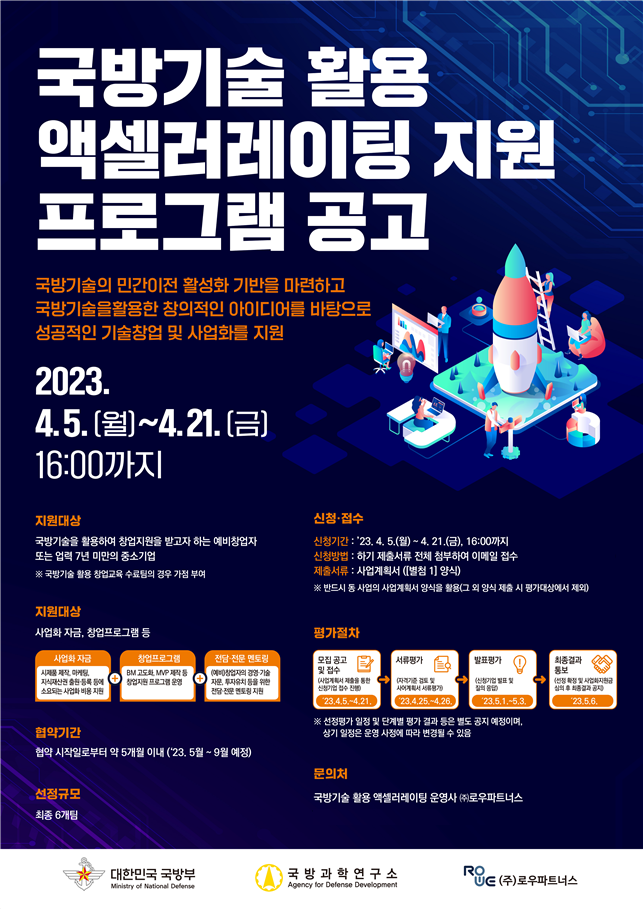 「2023년 국방기술 활용 액셀러레이팅 지원 프로그램」은 국방과학연구소가 보유한 특허기술의 민간 이전 활성화 기반을 마련하고, 국방기술을 활용한 창의적인 아이디어를 바탕으로 성공적인 기술창업 및 사업화를 지원하는 프로그램이다.