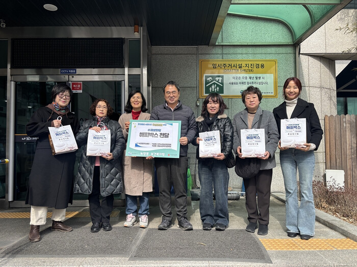 경기 의정부시 녹양동 주민센터가 최근 저소득 노인가구의 안부를 확인하고, 물품을 전달하는 ‘해피박스 전달’ 행사를 개최했다. 사진은 행사에서 관계자들이 기념 촬영을 하는 모습. (사진=의정부시청 제공)