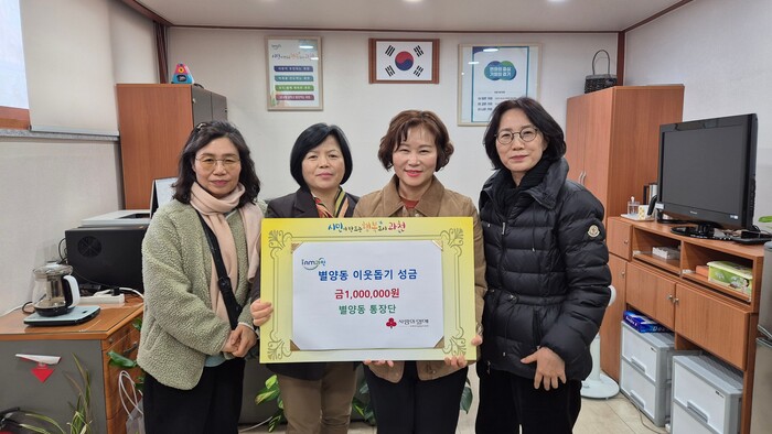 경기 과천시 별양동 통장단이 지난 25일, 지역 내 어려운 이웃을 돕기 위해 성금 100만원을 기부했다. 이번 기부금은 통장들이 십시일반 모은 성금으로 마련됐으며, 경기도 사회복지공동모금회에 지정 기탁됐다. 사진은 참석자들이 기념촬영을 하고 있는 모습. (사진=과천시청 제공)