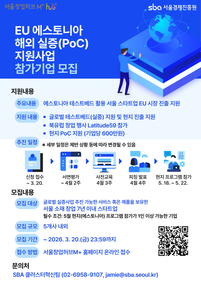 [시민일보 = 여영준 기자] 서울시와 서울시 중소기업 지원기관 서울경제진흥원(SBA)은 오는 20일까지 ‘에스토니아 해외 실증(PoC)’ 프로그램에 참가할 기업을 모집한다고 18일 밝혔다.