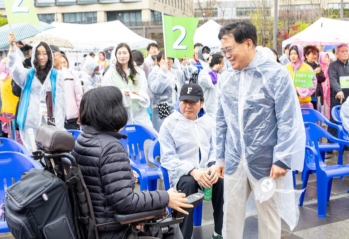 | ▲ 진교훈 서울 강서구청장(오른쪽)이 서울식물원에서 열린 ‘제23회 한 걸음의 사랑 걷기대회’를 찾아 참가자와 대화를 나누고 있다. (사진=강서구청 제공) |