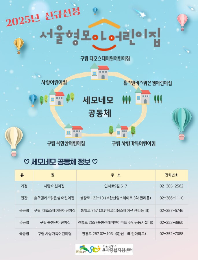 ‘세모네모 공동체’는 사랑어린이집, 홀츠앤키즈맑은샘, 구립사랑가득어린이집, 구립북한산어린이집, 구립대조스테이원어린이집 총 5개소이다. 이번에 서울시 ‘서울형 모아어린이집’에 선정됨에 따라 은평구의 모아어린이집은 기존의 ▲우리누리 공동체 내 4개소 어린이집 ▲꼼지락 공동체 내 4개소 어린이집 ▲동네방네 공동체 내 5개소 어린이집을 포함해 총 4개 공동체 18개소 어린이집으로 확대 운영된다.