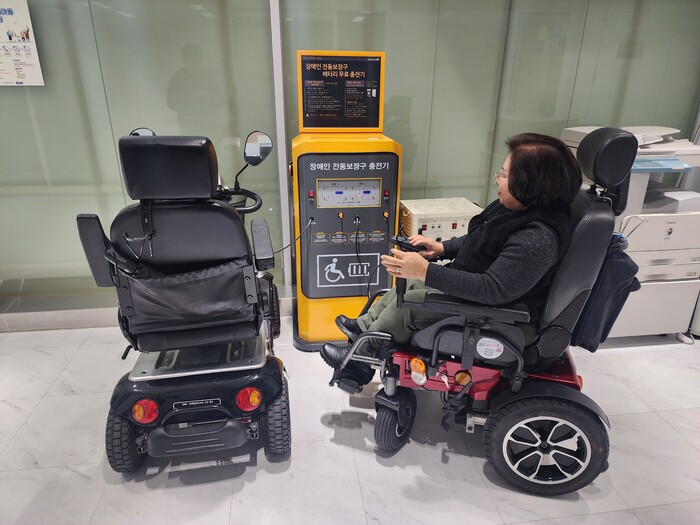 | ▲ 장애인 전동보장구 급속충전기 사용 모습. (사진=노원구청 제공) |