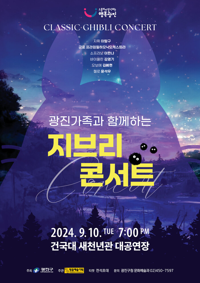 [시민일보 = 여영준 기자] 서울 광진구(구청장 김경호)가 오는 9월10일 오후 7~8시 건국대학교 새천년관 대공연장에서 오케스트라 공연 ‘지브리 콘서트’를 개최한다.