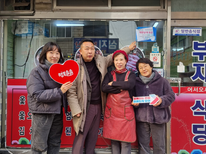 경기 오산시 신장2동과 신장2동 지역사회보장협의체가 최근 나눔으로 지역복지를 실천하는 착한가게 4호점 부자식당과 5호점 오산효요양원에 착한가게 현판을 전달했다. 사진은 현판을 전달받은 부자식당 관계자들이 기념 촬영을 하는 모습. (사진=오산시청 제공)