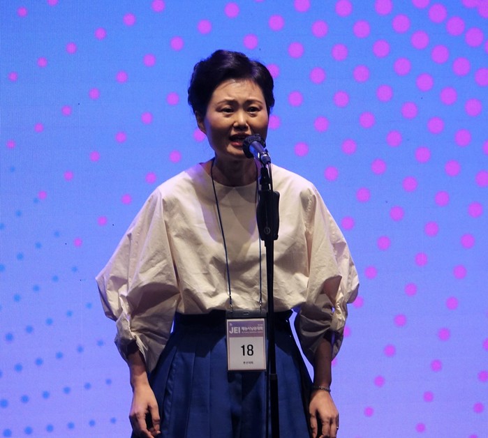 | ▲ 제32회 '재능시낭송대회' 대상 수상자 조영실씨가 ‘약속-오는 날의 잉태와 탄생(신석정)’을 낭송하고 있다.(사진제공=재능교육) |