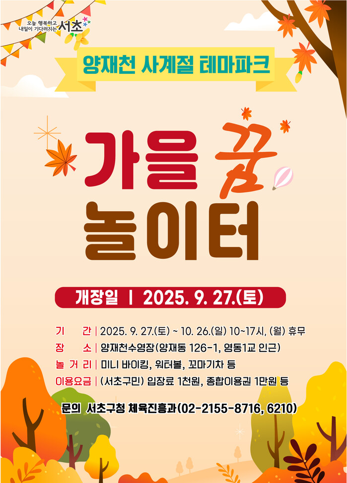 [시민일보 = 박소진 기자] 서초구(구청장 전성수)는 지난 여름 큰 사랑을 받았던 양재천 수영장을 가을을 맞아 오는 27일부터 어린이 테마파크인 ‘가을꿈놀이터’로 운영한다고 밝혔다.