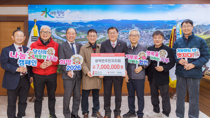 김윤철 합천군수는 “추운 날씨에 어려운 이웃들에게 따뜻한 사랑을 나눠주신 쌍책면주민자치회에 감사드리며, 소중한 성금은 도움이 필요한 이웃에게 잘 전달되도록 하겠다”고 감사의 마음을 전했다.