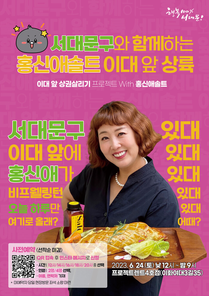 [시민일보 = 홍덕표 기자] 서울 서대문구(구청장 이성헌)가 이대 상권 활성화의 일환으로 홍신애 스타셰프를 초청해 팝업 레스토랑을 오는 24일 개최한다.