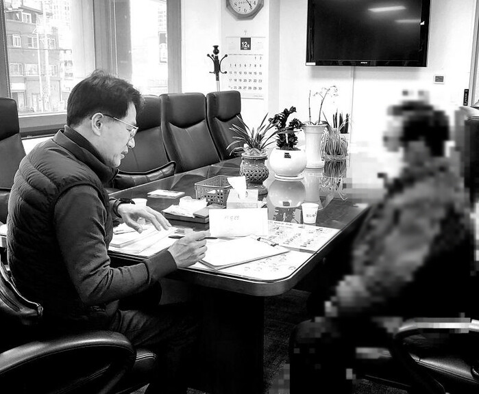| ▲ 이필형 구청장(오른쪽)이 익명의 기부자와 함께 이야기를 나누고 있다. (사진=동대문구청 제공) |