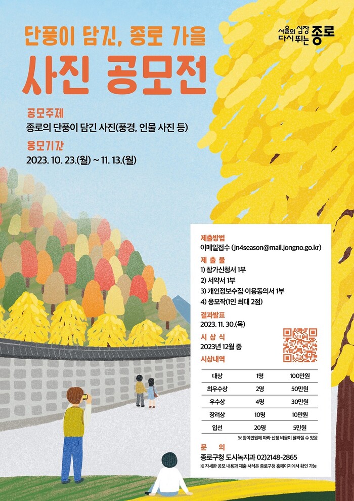 24일 구에 따르면 공모전 주제는 ‘종로의 단풍이 담긴 사진’으로, 풍경, 인물 사진을 포함하며 흑백사진은 제외된다.