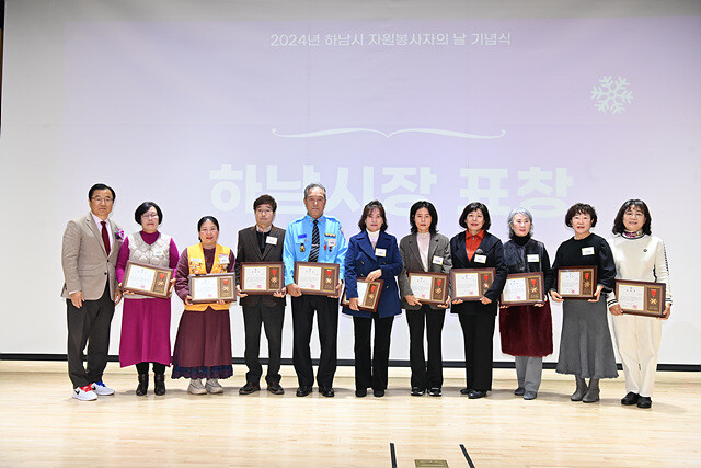 경기 하남시자원봉사센터가 4일 자원봉사자 및 지역내 유관단체 등 350명이 참석한 가운데, 시청 별관 2층 대강당에서 2024 하남시 자원봉사자의 날 기념식을 진행했다. 사진은 기념식에 참석한 이현재 시장(왼쪽)이 우수 봉사자들과 기념 촬영하는 모습. (사진=하남시청 제공)