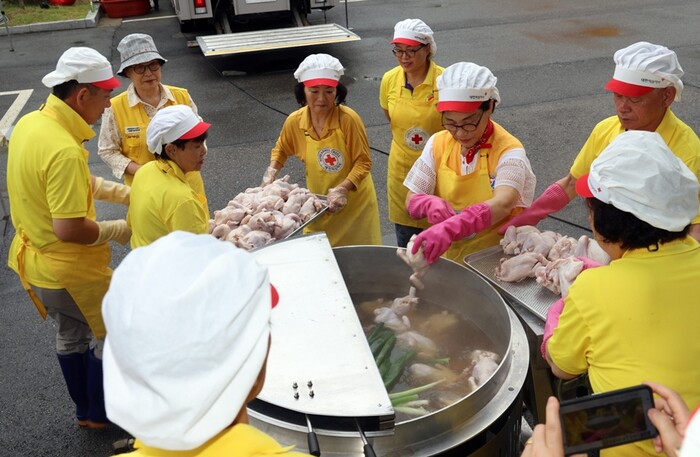 대한적십자사 경기 의정부지구협의회는 최근 ‘희망풍차와 함께하는 삼계탕 나눔 봉사’를 실시해 직접 조리한 삼계탕 200그릇을 의정부시 희망풍차 결연세대 약 147가구에 전달했다. 사진은 적십자 봉사원들이 삼계탕을 조리하고 있는 모습. (사진=의정부시청 제공)